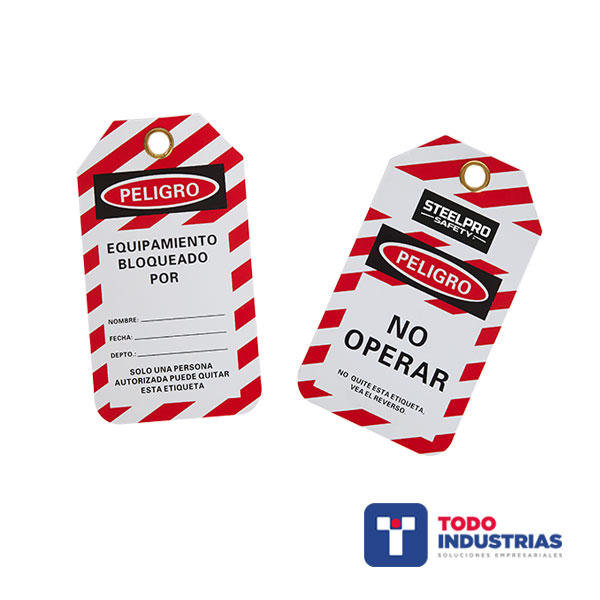 - Tarjeta plástica de bloqueo con brida y ojal metálico de alta resistencia y durabilidad.